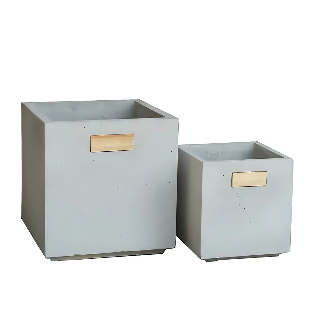 Die eckigen Blumenkübel für draußen werden aus hochwertigem Glasfaser-Beton gefertigt und mit einem stilvollen Holzelement verziert. Im Set enthalten ist jeweils ein Pflanztopf mit den Maßen 30x28x28cm und 40x39x39cm (HxBxT) enthalten.