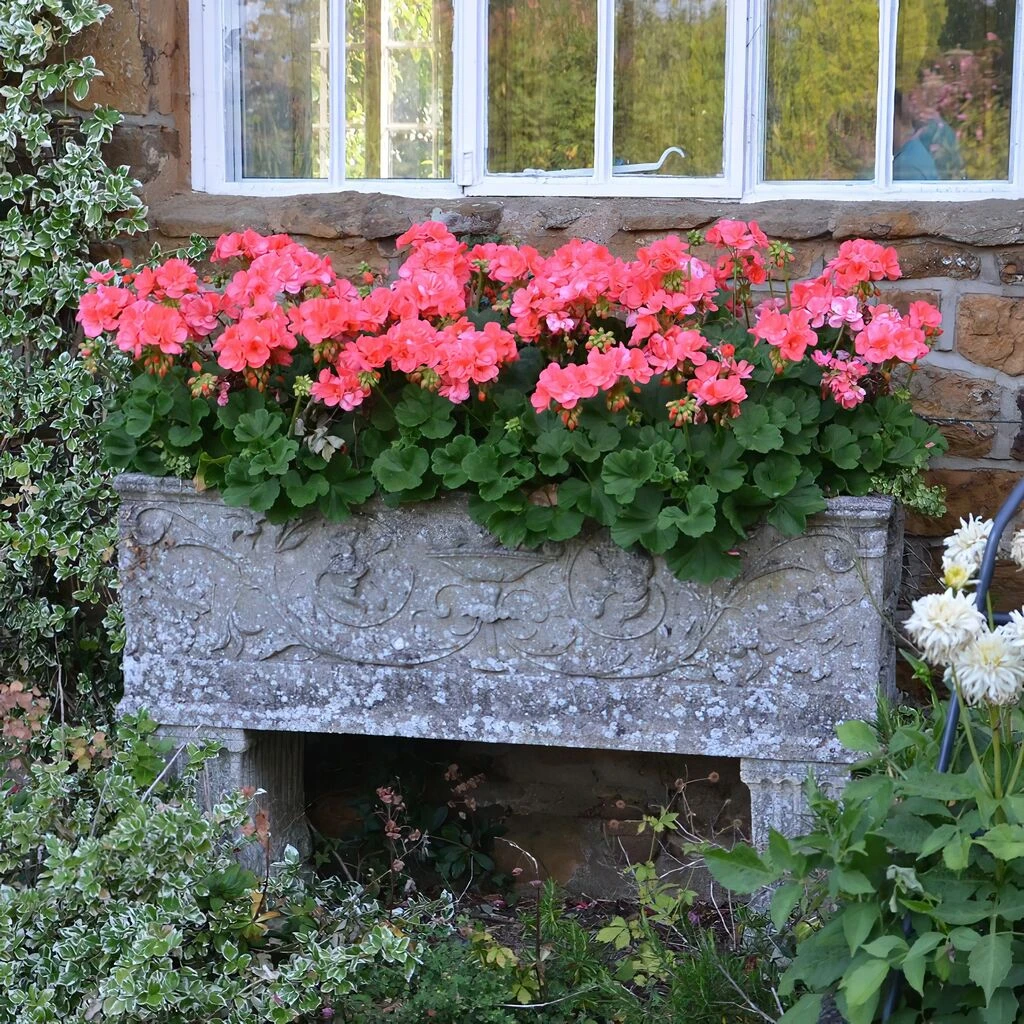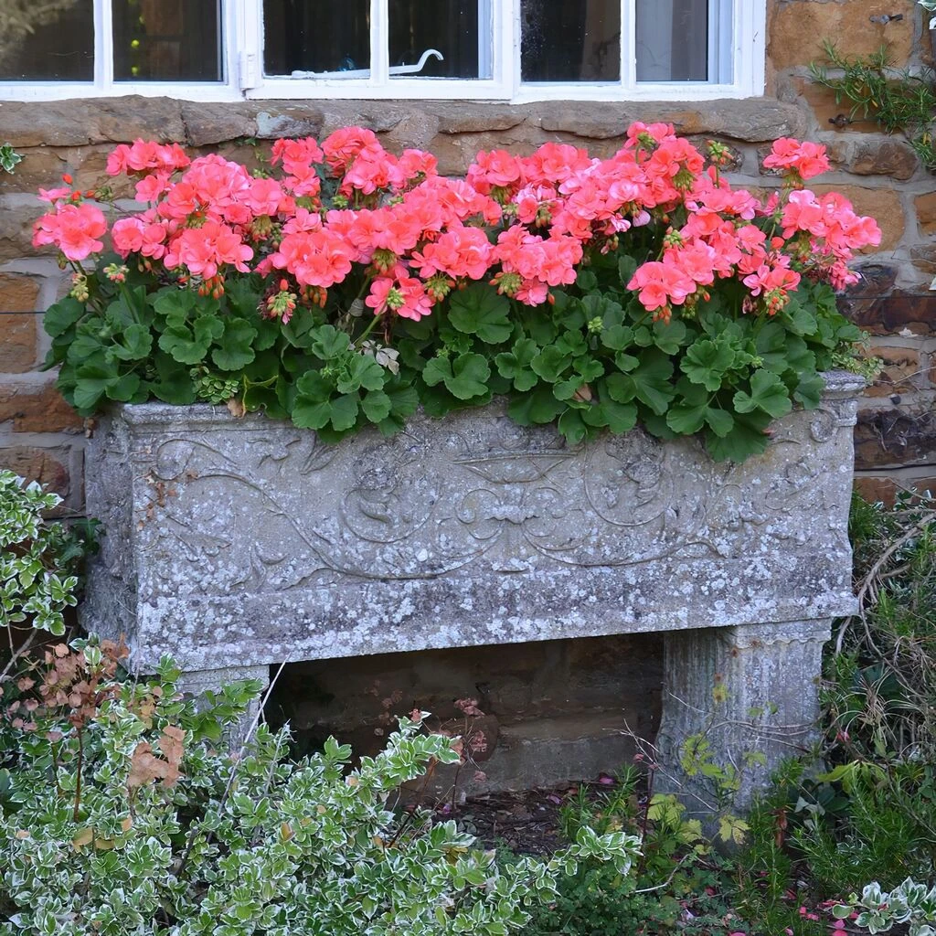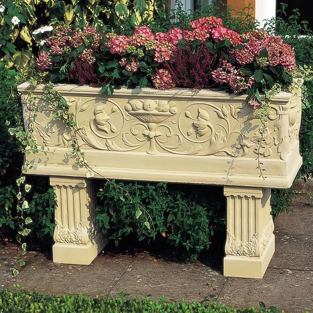 Großer Blumenkasten aus Stein mit edlen Verzierungen, frostsicher