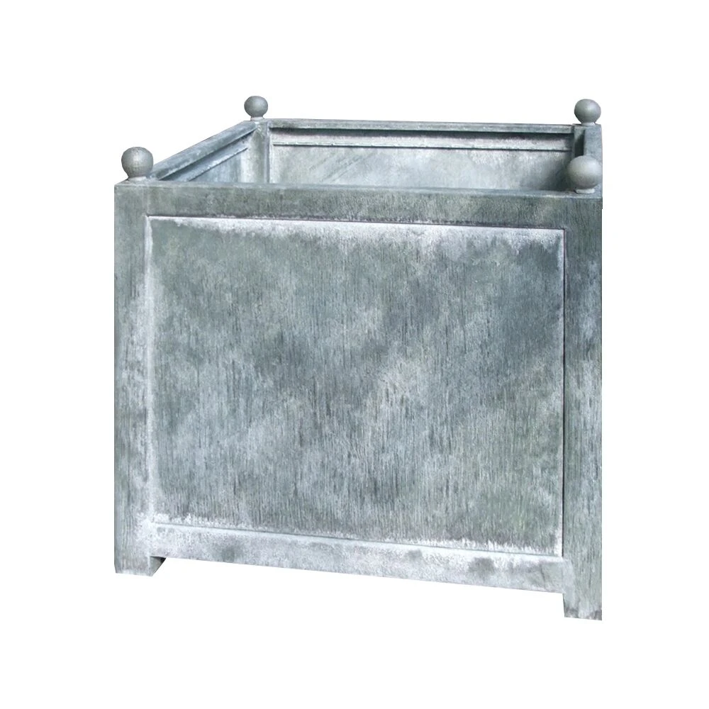 Mit kleinen Kugel-Finals versehen, ist dieses Pflanzgefäß ein Blickfang im Garten. Der Blumentopf ist verzinkt oder mit einer Rostpatina erhältlich. Die Abmessungen der Öffnung betragen 46x46cm (BxT), die Innenmaße 36,7x50x50cm (HxBxT).